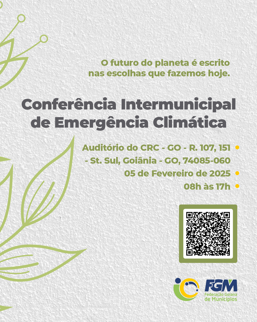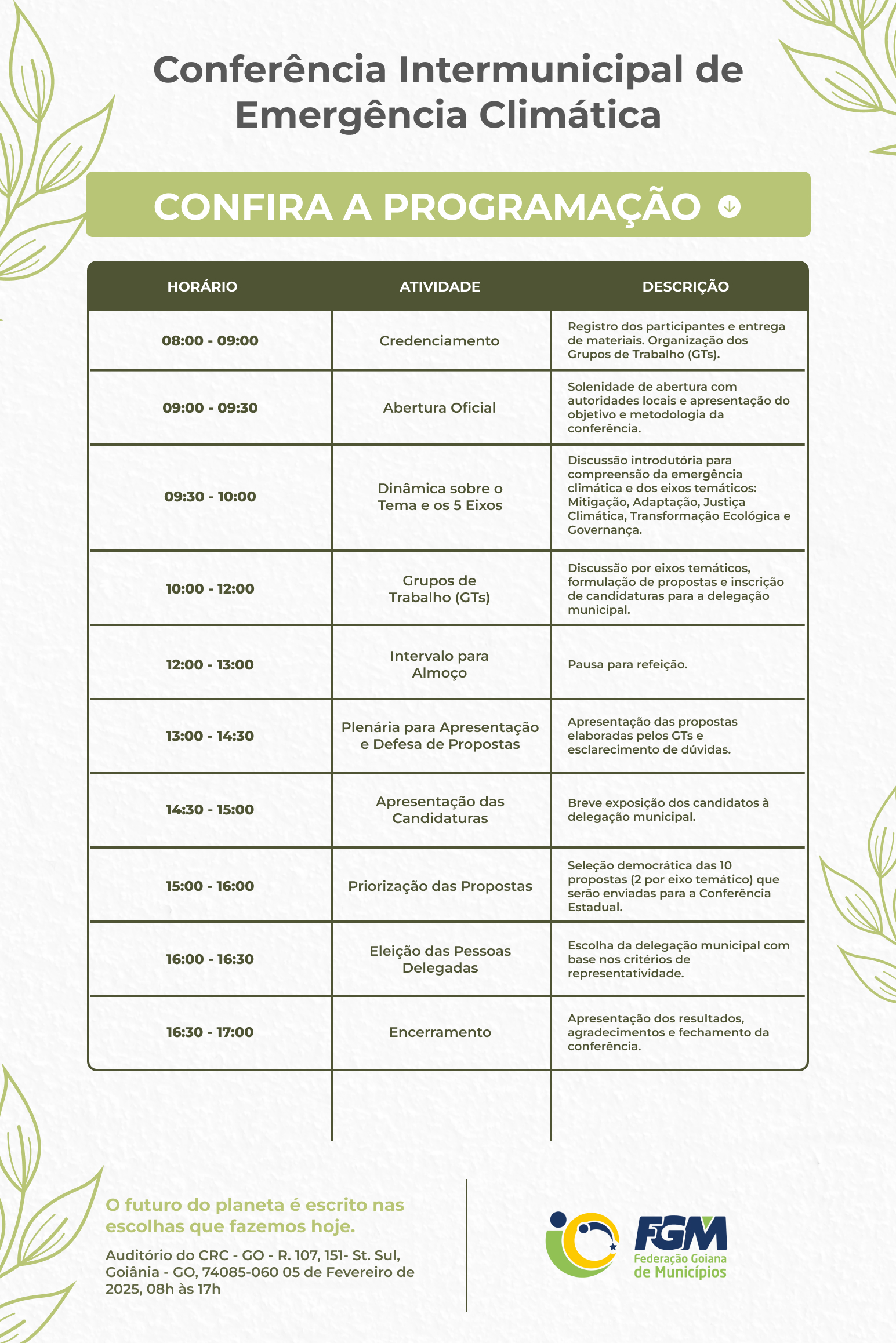 A Federação Goiana de Municípios (FGM) informa que a Conferência Intermunicipal de Emergência Climática, inicialmente programada para o dia 22 de janeiro, foi adiada para o dia 05 de fevereiro de 2025. O evento ocorrerá no mesmo local, no Conselho Regional de Contabilidade de Goiás (CRC), em Goiânia, das 8h às 17h.