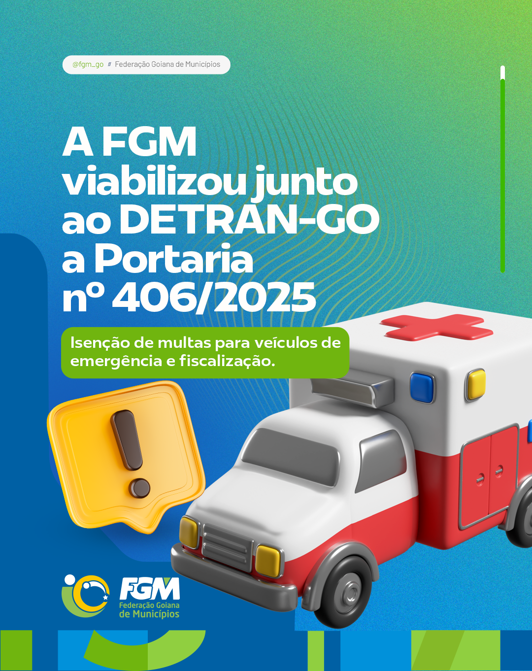 A Federação Goiana de Municípios (FGM) comemora mais uma importante conquista para os municípios goianos: a publicação da Portaria nº 406/2025 pelo Departamento Estadual de Trânsito de Goiás (DETRAN-GO). A norma regulamenta a isenção de multas de circulação, parada e estacionamento para veículos utilizados em serviços de emergência, urgência e fiscalização, inclusive os não caracterizados ostensivamente, nos termos do §6º do art. 280 do Código de Trânsito Brasileiro (CTB).