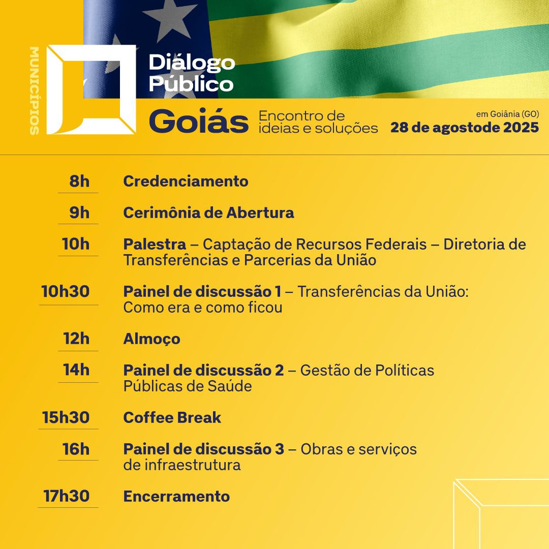 A capital goiana será palco do evento Diálogo Público – Encontro de Ideias e Soluções, que acontecerá no dia 28 de agosto, reunindo gestores públicos de todo o estado. A iniciativa é promovida pelos Tribunais de Contas da União (TCU), do Estado de Goiás (TCE-GO) e dos Municípios de Goiás (TCM-GO), com o apoio institucional da Federação Goiana de Municípios (FGM). O evento será realizado em Goiânia e contará com a presença de autoridades federais, estaduais e municipais.