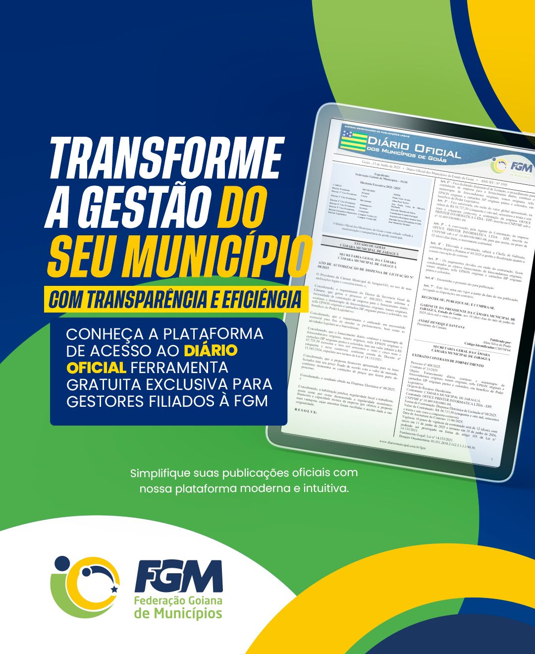 A Federação Goiana de Municípios (FGM) disponibiliza a seus filiados uma solução moderna e indispensável para a administração pública: o Diário Oficial dos Municípios do Estado de Goiás. A ferramenta, gratuita e 100% digital, garante publicações com validade jurídica, autenticidade e integridade, conforme os padrões da ICP-Brasil — assegurando total conformidade legal às ações municipais.
