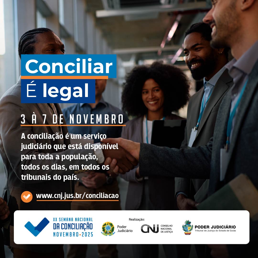 A Federação Goiana de Municípios (FGM) informa aos gestores municipais que o Tribunal de Justiça do Estado de Goiás (TJGO) solicitou apoio para a divulgação e mobilização em torno da XX Semana Nacional da Conciliação, que será realizada entre os dias 3 e 7 de novembro de 2025, em todo o país.