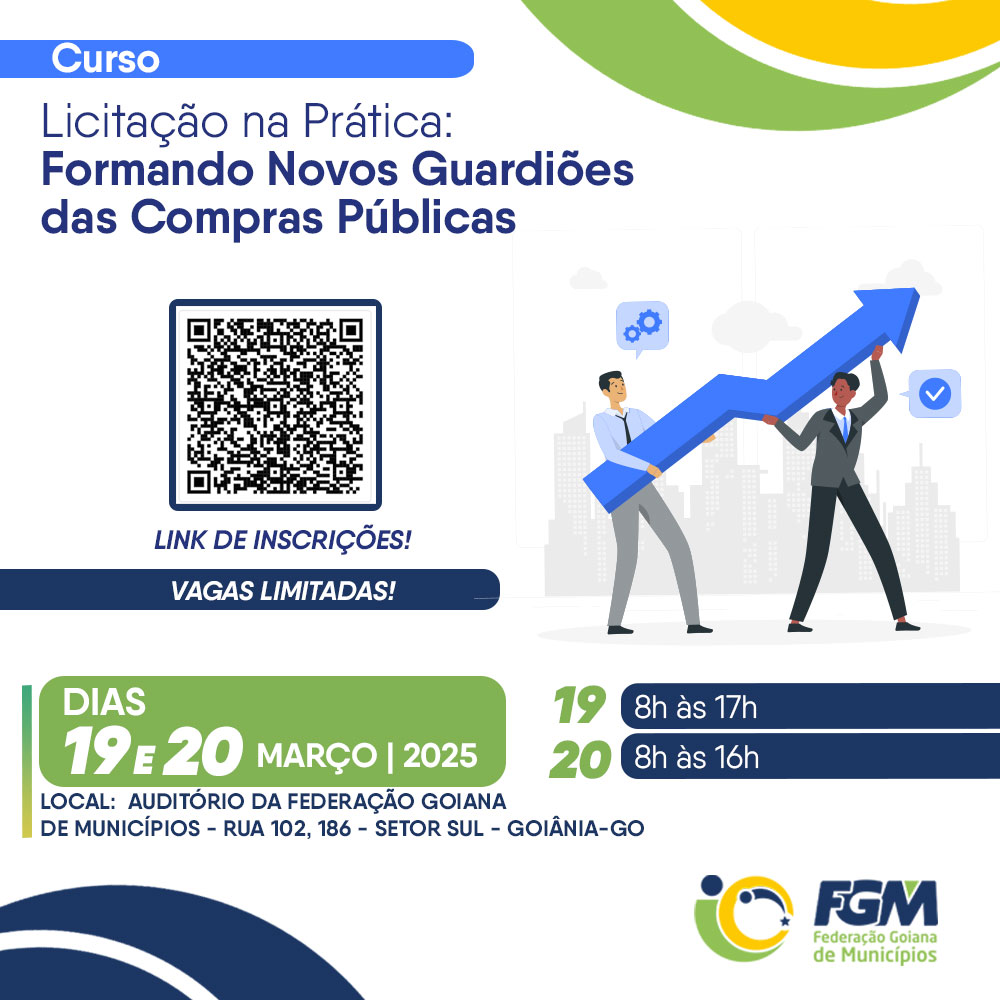 A Federação Goiana dos Municípios (FGM) realiza, nos dias 19 e 20 de março, o curso “Licitação na Prática: Formando os Novos Guardiões das Compras Públicas”, voltado para gestores municipais que atuam na área de compras e contratações públicas. O evento será realizado no auditório da FGM e contará com uma programação intensiva sobre os procedimentos licitatórios, oferecendo orientações essenciais para garantir maior eficiência, transparência e conformidade com a legislação vigente.
