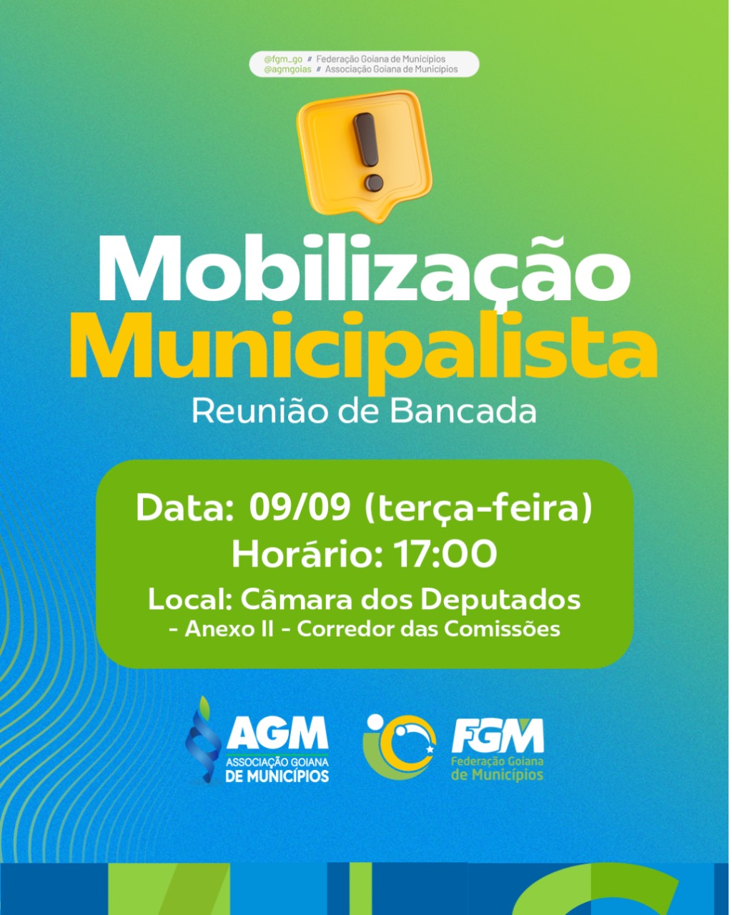 A Federação Goiana de Municípios (FGM), a Associação Goiana de Municípios (AGM) e a Confederação Nacional de Municípios (CNM) realizam, no próximo dia 9 de setembro, às 17h, uma reunião conjunta com gestores municipais e a bancada federal goiana, na Câmara dos Deputados (Anexo II, Corredor das Comissões – plenário a confirmar).