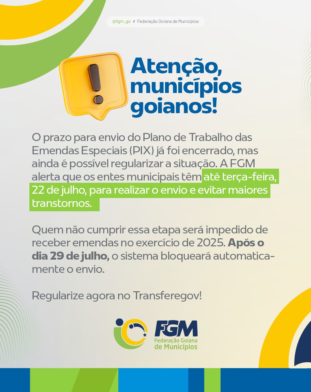 A Federação Goiana de Municípios (FGM) faz um alerta às prefeituras que ainda não enviaram o plano de trabalho necessário para a liberação das emendas parlamentares especiais, transferidas diretamente via PIX. A entrega do documento é condição indispensável para garantir o recebimento dos recursos.
