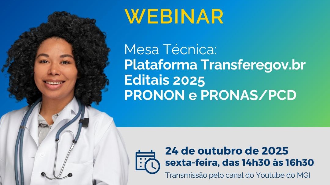 Na próxima sexta-feira (24 de outubro de 2025), das 14h30 às 16h30, será realizado o webinar intitulado “Mesa Técnica: Plataforma Transferegov.br, Editais 2025 PRONON e PRONAS/PCD”, destinado a gestores federais, estaduais e municipais e demais interessados em subsídios para a participação nos editais desses programas. O evento será transmitido ao vivo pelo canal oficial do YouTube da Ministério da Gestão e da Inovação em Serviços Públicos (MGI).